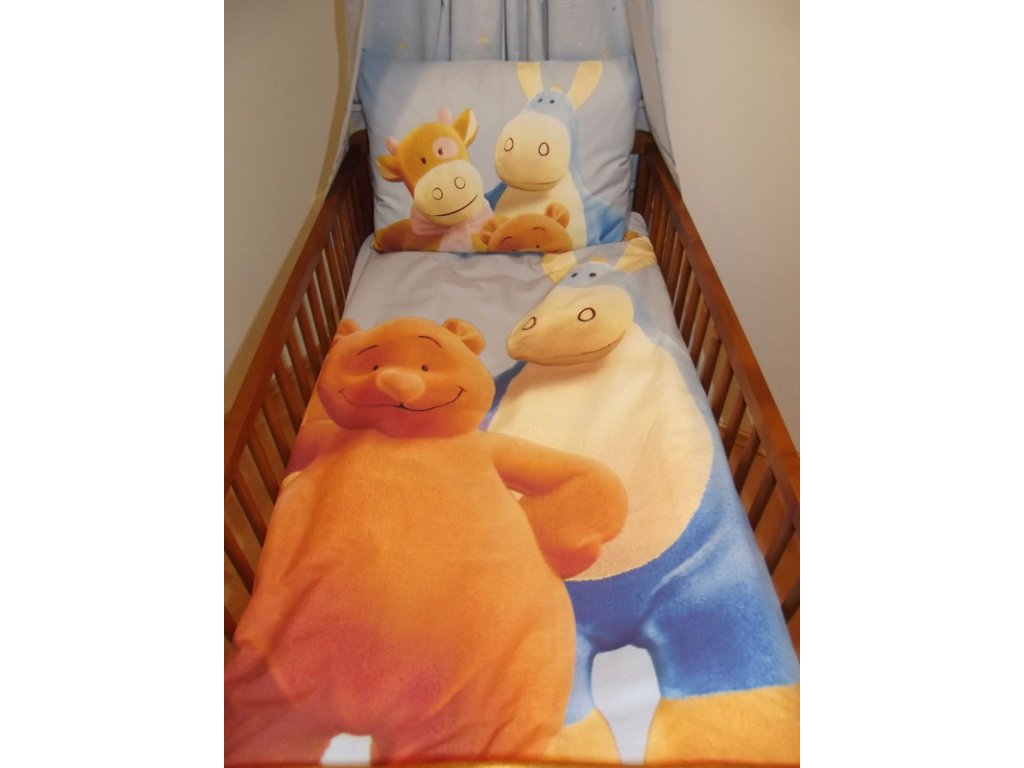 Dětské bavlněné povlečení s velikými kamarády medvídkem Nouky, Oslíkem Paco a kravičkou Lolo z obllíbeného seriálu Nouky a jeho přátelé.